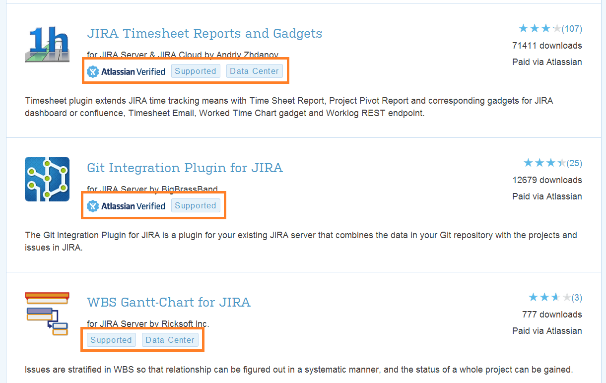 Addonを販売するAtlassian MarketplaceでもData Centerラベルが付いてData Centerに対応していることが分かります。Data CenterはJIRA6.3, Confluence5.6から対応となり、クラスタリングを実現するため製品のベースメカニズムに変更が入っています。一方、AddonはJIRA6.2でもJIRA6.3でも1つのファイルで対応できるのが望ましいため、Addonはベースメカニズムが違うJIRAの上でも1つのファイルで動作するように改修する必要があります。この対応を行ったAddonにData Centerラベルが付いています。