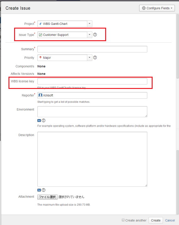 まず、「Issue Type(課題タイプ)」で「Customer Support」を選択すると、「WBS license key」の項目があることがわかります。