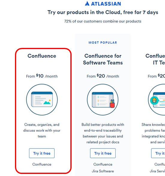 Confluence Cloudは10ユーザーまでなら、月額$10(約1100円/月額)なので、気軽に利用できます。