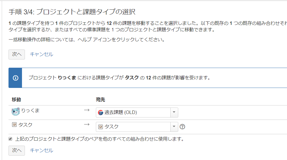 今回はプロジェクトの変更なので、「課題の移動」を選びます。