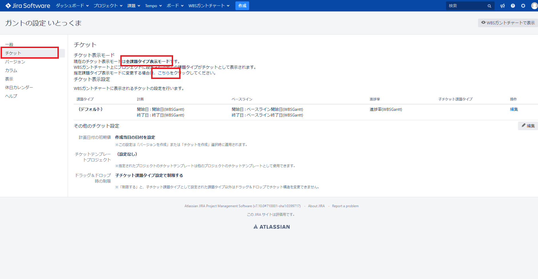 チケット表示モードを変更する場合は、4行目にある「こちら」のリンクをクリックして変更します。以下のスクリーンショットをご覧ください。こちらは「全課題タイプ表示モード」の例です。