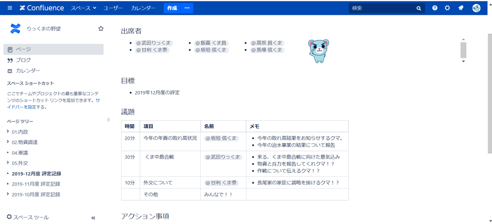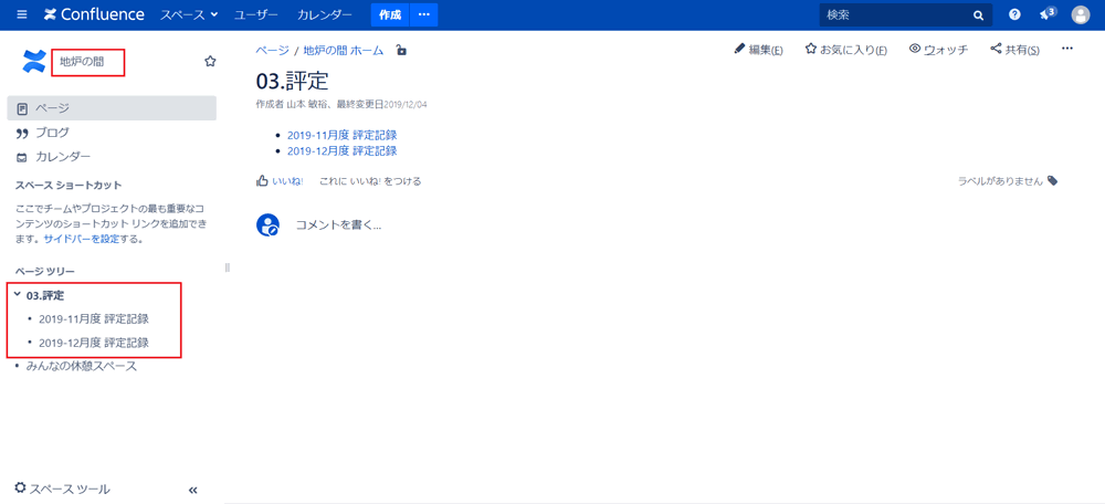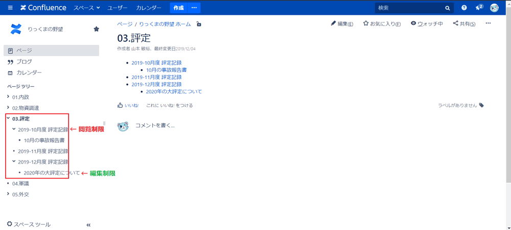 ここでユーザー「武田りっくま」が「03.評定」配下のページ、「2019-10月度 評定記録」に閲覧制限(下図の赤い部分)、「2020年の大評定について」に編集制限(下図の緑部分)をかけます。