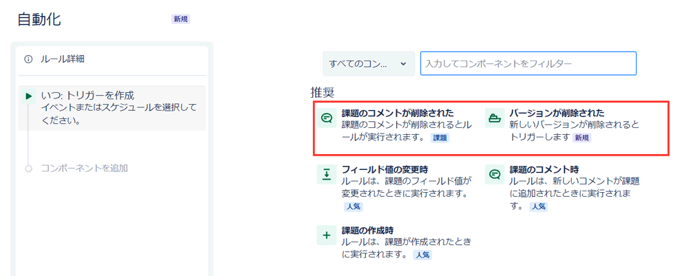 Jira Cloud の自動化機能に、「課題のコメントが削除された」が新しくトリガーに追加されました。