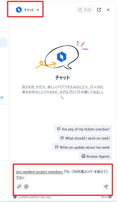 Atlassian Rovo の機能の Rovo チャットで、Rovoに質問を出してみます。